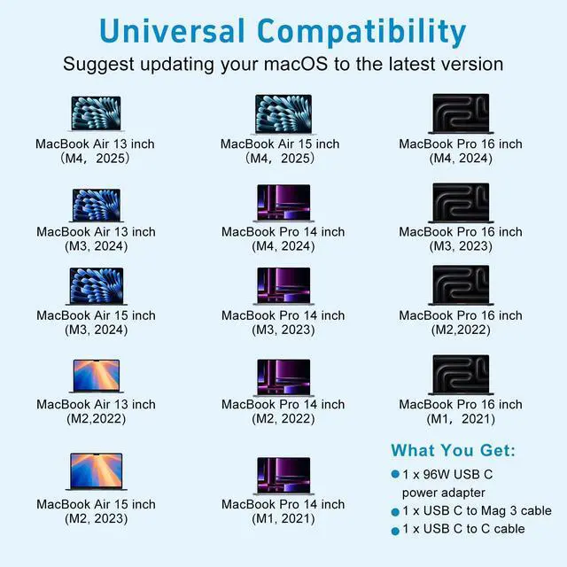 Universal Compatibility: 96W USB C power adapter compatible with 2025, 2024, 2023, 2022, 2021, 2020 Mac Pro/Air 14, 15, 16-inch, M4/M4 Pro/M4 Max; M3/M3 Pro/M3 Max; M2/M2 Pro/M2 Max; M1. Can replace Charger 30W, 70W, 96W.