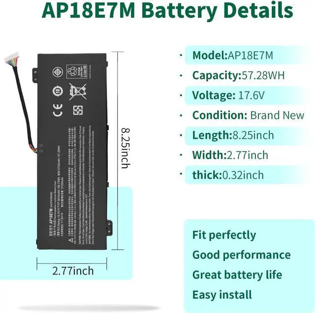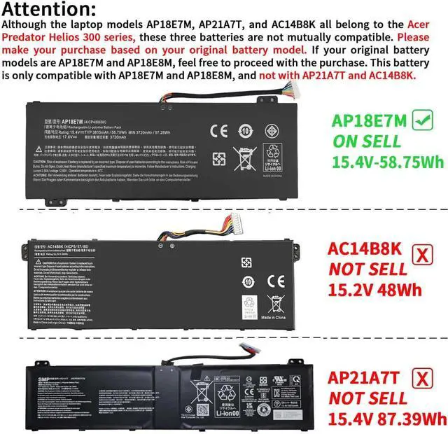 Compatible Models: AP18E8M Battery for Acer Nitro 5 AN515-54 AN515-54-51m5 AN515-43 AN517-51 AN517-52 AN715-51 Series; for Acer ConceptD 3 Pro CN315-71P Series; for Acer ConceptD 5 Pro CN515-71 Series; for Acer ConceptD 5 Pro CN515-71P Series; for Acer Predator Triton 300 PT315-51 Series; for Acer Predator Helios 300 PH315-52 PH315-53 PH317-53 Series; for Acer Aspire 7 A715-74G Series
