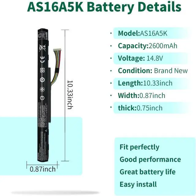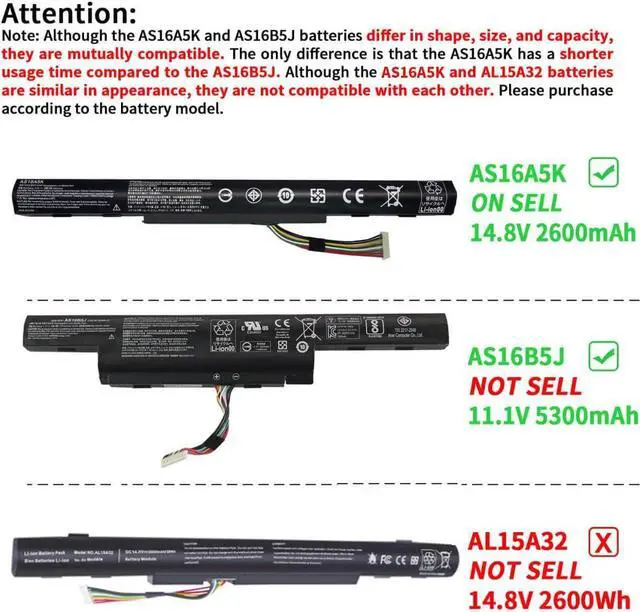 Compatible Models: AS16A5K Battery for Acer Aspire E15 E5-475 E5-475G E5-523 E5-523G E5-553 E5-553G E5-575 E5-575G E5-575T E5-575TG E5-576 E5-576G E5-774 E5-774G Series E5-575G-30ZJ E5-575G-3561 E5-575G-50CB E5-575G-50QS E5-575G-513W E5-575G-52DD E5-575G-52NP E5-575G-534D E5-575G-53B8 E5-575G-54TU E5-575G-54XH E5-575G-55NS E5-575G-55S7 E5-575G-56ED E5-575G-56GU E5-575G-56KS E5-575G-56WG E5-575G-58TF E5-575G-58UJ E5-575G-59EE E5-575G-59GV E5-575G-765N E5-575G-76YK E5-575G-78GH