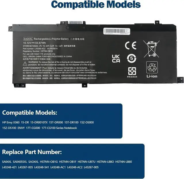 Compatible Laptop ModelsSA04XL Battery for HP Envy X360 15-DR 15-DR0000 15-DR1000 15T-DR0000 15T-DR1000 15-DR0010TX Series; HP Envy X360 15-DS 15-DS0000 15-DS1000 15M-DS0000 15M-DS0011DX Series; HP Envy X360 17-CG 17-CG0000 17-CG1000 17T-CG1000 17M-CG0000 Series; for HP Envy X360 15M-DR 15M-DS 15-DR 15T-DR 15-DS 15Z-DS 15S-DR 17-CG 17M-CG 17T-CG series.