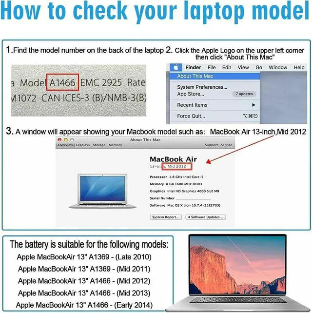 Compatible With MacBook Air 13 inch Computer Model: MC503LL/A, MC504LL/A, MC965LL/A, MC966LL/A, MD231LL/A, MD232LL/A, MD760LL/A, MD761LL/A, MD760LL/B, MD761LL/B, MJVE2LL/A, MJVG2LL/A, MC503LL/A, Please Check Your MacBook Model correctly match our battery. You can access this information on your computer by: Logo on the upper left corner of the MacBook screen About this Mac