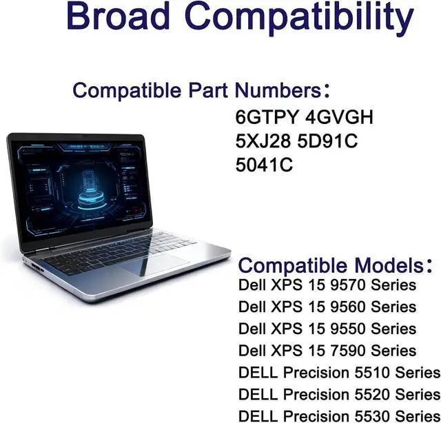 Compatible Laptop/Notebook Models for Dell XPS 15 9560; Dell XPS 15 9570; Dell XPS 15 7590; Dell Inspiron 15 7590; Dell Vostro 7500; Dell Precision 5510 M5510; Dell Precision 5520 M5520; Dell Precision 5530 M5530; Dell Precision 5540 M5540