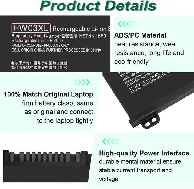 Compatible Battery model: HW03XL battery for HP L97300-005/ HW03XL / HWO3XL / HW03041XL / L96887-421 / L96887-422/ HSTNN-IB90 / HSTNN-IB9O / HSTNN-LB8U / HSTNN-LB8 / HSTNN-OB2A / HSTNN-DB9Y / L96887-1D1 / L96887-421 / L96887-AC1 / L96887-2B1 battery