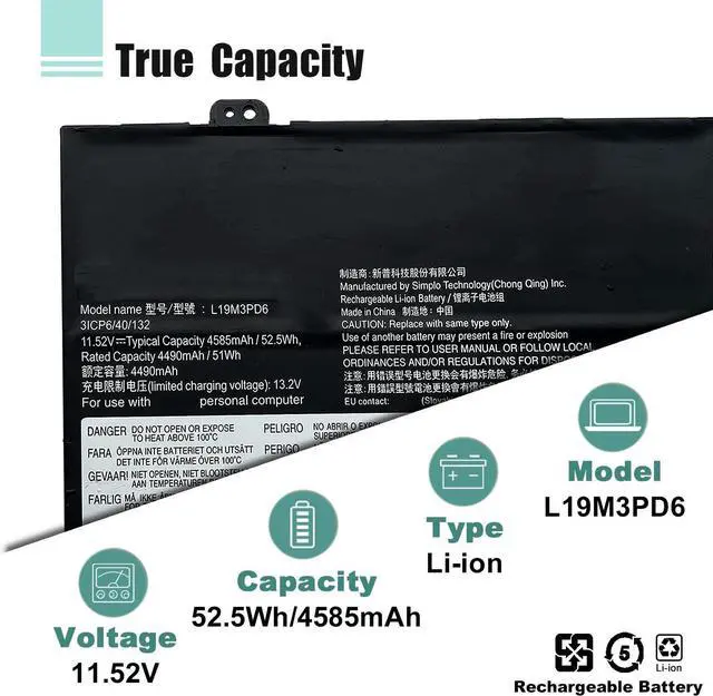 Replacement for Part Number P/NL19L3PD6/ SB10X49074/ 5B10X49077/ L19M3PD6/ SB10X49076/ 5B10X49072/ L19C3PD6/ SB10X49078/ 5B10X49073/ L19D3PD6/ SB10X49071/ 5B10X49075/ 3ICP6/40/132, 3ICP6/40/133