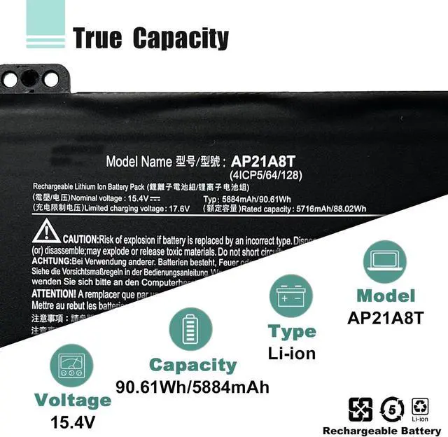 SpecificationsBattery Model: AP21A8T Rechargeable Battery, Voltage: 15.4V, Capacity: 90.61W h 5716mAh, Cells: 8-cell, Type: Li-ion Battery, Package