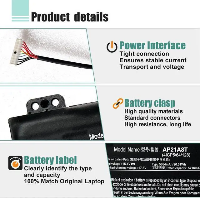 Quality AssuranceOur AP21A8T laptop battery is highly compatible with the original AP21A8T Battery for acer ap21a5t battery and meets CE/FCC/ROHS/UL certified standards. Strict guidelines for compatibility, Use of built-in circuit protection to ensure safety and stability. For assistance with the AP21A8T battery, please visit our product detail page OR please contact us by email at any time, our professional technical team is standing by to provide you with assistance and service.