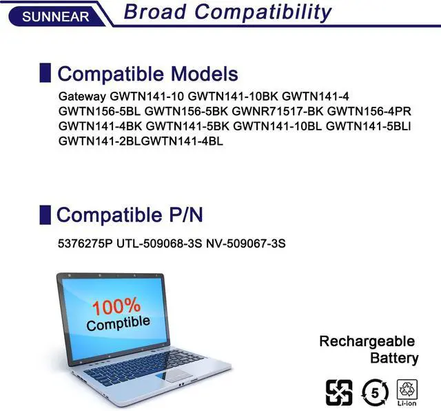 Compatible Laptop/Notebook Models for Gateway GWTN141-10BK GWTN141-4 GWTN156-5BL Gwtn141-4bl UTL-509068-3S NV-509067-3S