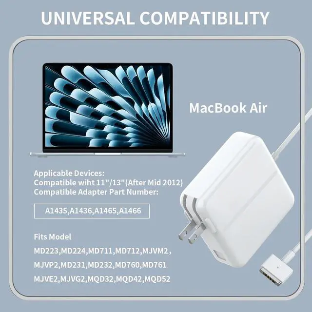 Perfect Replacement for 2012-2017 MacBook Air. This 45W Magnetic T-tip power adapter is compatible with MacBook Air 11 and 13 models (2012-2017) including model numbers A1435 A1436 A1465 A1466. NOT compatible with 2022 or later MacBook Air modelsStandard & Safe Charging