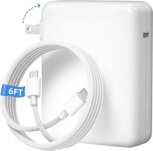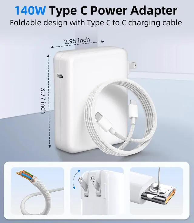 Fast charge MacBook Pro 16 inch to 80% in just 30 mins. Auto-adjusts output for full compatibility with 140W 96W 87W 70W 67W 61W 45W 30W devices. One type c charger for allPrecision Dual-Chip Protection Equipped with intelligent dual-chip system for real-time temperature monitoring (36 000 times/hr) and multi-layer safety: Over-voltage Over-current Over-heat & Short-circuit. Keep your macbook battery healthier and safer with every charge. MacBook Charger USB C Built to Travel Foldable plug global 100-240V input and ultra-strong 6ft braided USB-C cable included. Your ultimate macbook air charger for office home airport or international trippower without limits. A Charger Thats Future-Proof Compatible with the latest MacBook M1-M5 iPad Pro 13/11 inch Steam Deck iPhone 17/16/15 Galaxy S25 Ultra Pixel 10 and more. Upgrade to a 140W type c chargerbecause your premium device deserves the best.