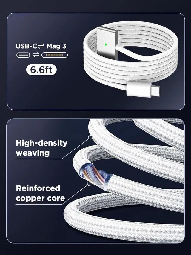 With a convenient 2-meter length it offers extended reach for flexible charging. The built-in LED indicator displays yellow while charging and turns green when fully charged providing instant feedback on your device's power statushat You Get1 x 140W USB C Mac Charger Power Adapter[28V/5A] & 1 x 6.6 ft USB C to Magnetic 3 Charging Cable
