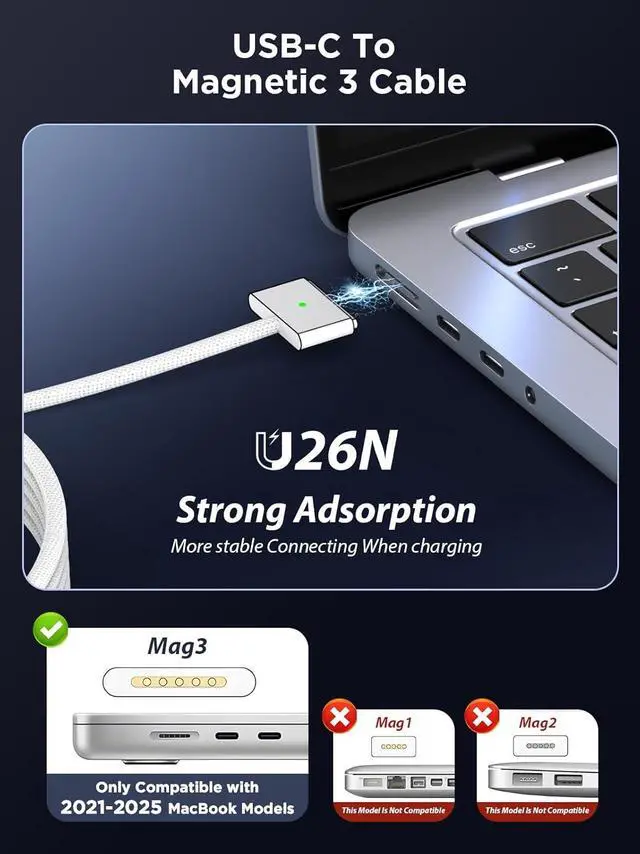 Ensure Full Compatibility with Your Device. Only Compatible with?????? 1-?????? 5 MacBook Models. Not for 2012-2020 Versions140W Super Fast ChargingWith the 140 watt Mac fast charger and USB C to 3 cableyou will get fast charging experience. The 2023 Mac book Pro 16 will be fully charged in just 1 hour with 50% charge in 30 minutesMultiple Safety ProtectionWith the highest quality materials the 140W Mac fast charger combines advanced hardware with software systems to against over-current over-voltage overload. Our Mac fast charger will also intelligently monitor temperature to ensure device healthExtensive Compatibility for MacBook ModelsPerfectly compatible with a wide range of MacBook devices including MacBook Pro 16-inch ( M1 Pro M1 Max M2 Pro M2 Max M3 M3 Pro M3 MaxM4) and MacBook Pro 14-inch (M1 Pro M1 Max M2 Pro M2 Max M3 Pro M3 MaxM4) from 2021 - 2025 as well 6.6FT Strong Magnetic Charging CableThis Gen3 magnetic cable is designed to provide a secure and stable connection forMacBook devices minimizing accidental disconnects and enhancing device protection.