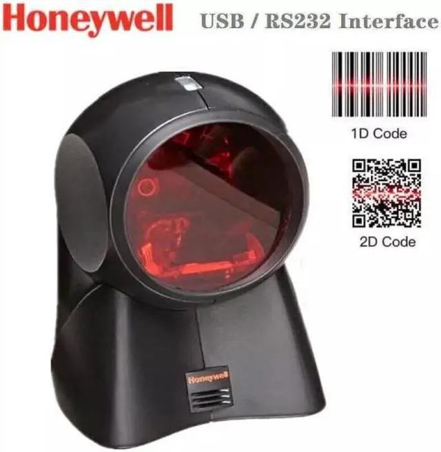 The Honeywell MS7120 Orbit barcode reader is black, can be held in the hand or set on a stand, produces laser light in an omnidirectional pattern,