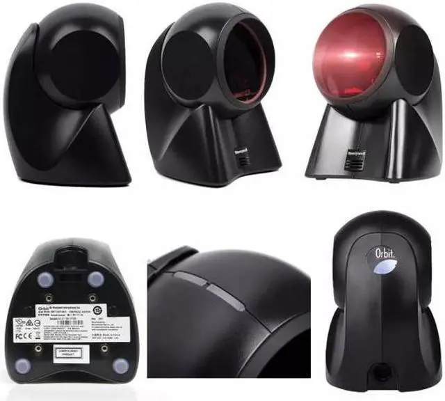 The Honeywell MS7120 Orbit barcode reader is black, can be held in the hand or set on a stand, produces laser light in an omnidirectional pattern,