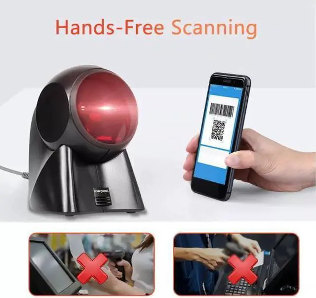 The Honeywell MS7120 Orbit barcode reader is black, can be held in the hand or set on a stand, produces laser light in an omnidirectional pattern,