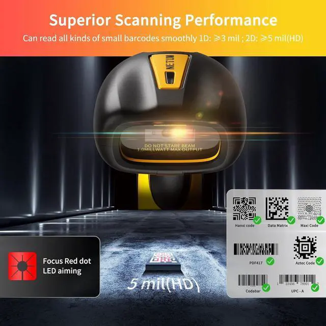 Superior Scanning Performance NETUM NT-1202W Barcode Scanner is equiped with advanced 1280H × 1024V pixels( 1.3M ) CMOS sensor. With high-speed global exposure, the scanning speed is faster, and Maximum frame rate 120FPS. it can read all kinds of small barcodes smoothly(1D: 3