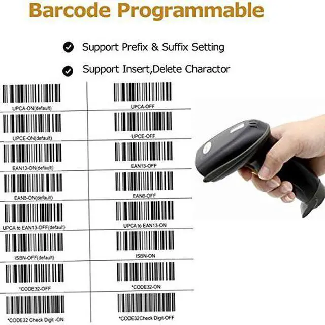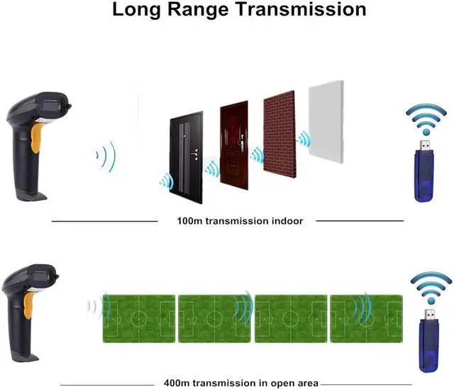 Long Range Transmission (433MHz better than 2.4G ): Our usb wireless bar code scanner delivers up to 1312 Feet (400m ) transmission in open air, 328 Feet (100m) transmission indoor.
