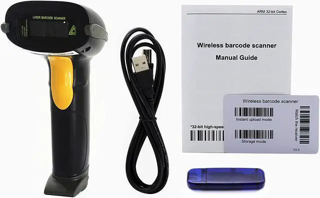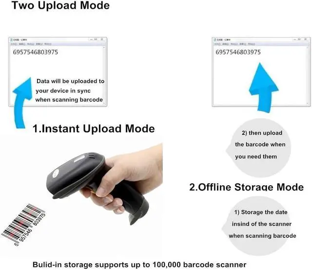 2 working modes: Our bar-code scanner include instant upload mode and storage mode. Internal offline storage supports up to 100, 000 barcodes in offline storage mode. Scan and store barcodes when far away from the receiver, and then update the data to your device when you come back entering the wireless transmission range.