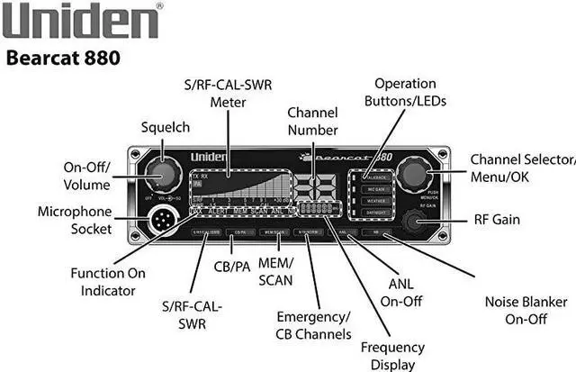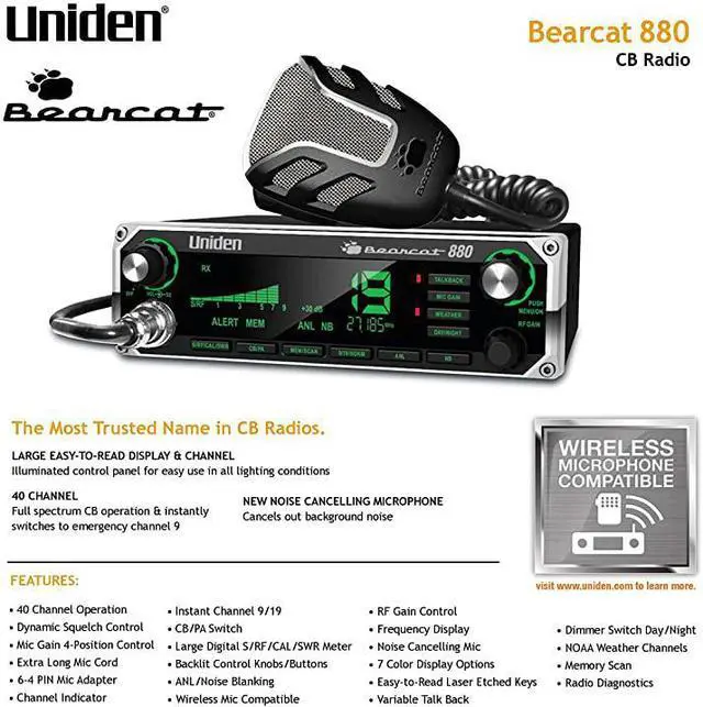 Pattern Name: RadioThe Bearcat 880 CB radio gives you the clearest reception, strongest transmissions and greatest range. It features a large, easy-to-read display and channel. The illuminated control panel is easy to use in all light conditions. It also has a noise cancelling microphone that cancels out background noise. This CB radio has 40 channel operation and dynamic squelch control and an extra long mic cord. There is a CB/PA switch and it' s even wireless mic compatible. Other features include instant channel 9/19, NOAA Weather channels, radio diagnostics, easy-to-read laser etched keys, and a 6-4 PIN mic adapter.
