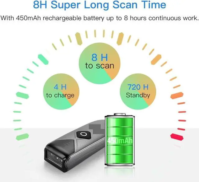 Built-in 450mAh rechargeable high-capacity battery can use up to 8 hours continuous scanning time. Ideal for organizing and cataloging your barcodes, no matter if you run a book store, online store, a sales shop, or work in a warehouse.