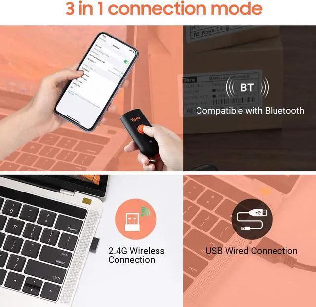 Tera Pro Wireless Barcode Scanner, Waterproof Shockproof Mini Pocket 2D Scanner, 3-in-1 Bluetooth & USB Wired & 2.4G Bar Code Reader Portable 2D QR Image Scanner Work with iOS, Windows, Android 1100D