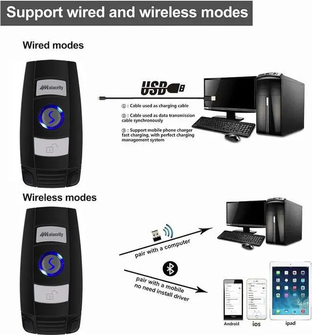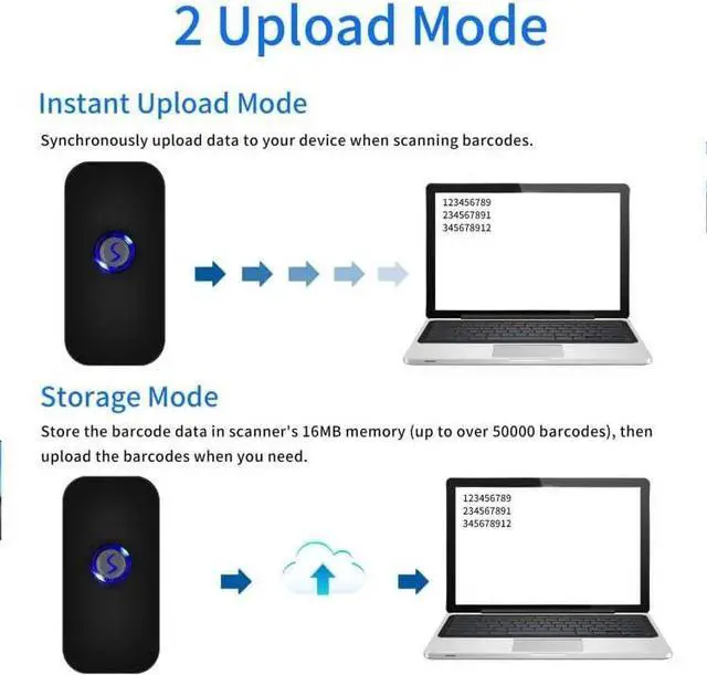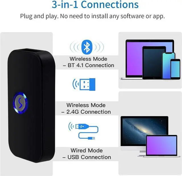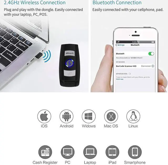 Mini Bluetooth Handheld Barcode Scanner Plug and Play, No need to install any software or application. It's a perfect scanner for mobile use, especially for office, book store, online store, retail store, warehouse, etc.
