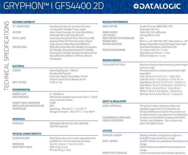 Data,log,ic GFS4450 2D Barco,de Scann,er Reader Module Fixed Mounting W/ RS232 Cable