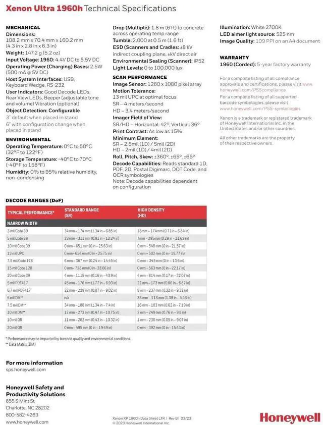 Honey,well 1960HHD-5USB-N / 1960H Xenon Ultra Bar,code Scan,ner with USB Cable NIB