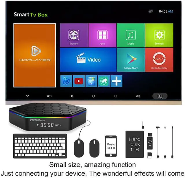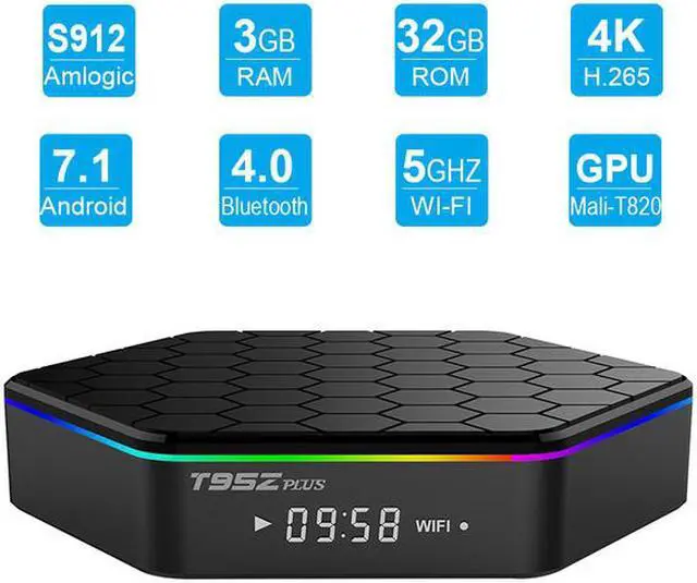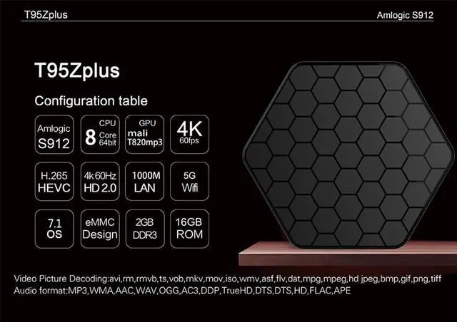 T95Zplus 2GB/3GB 16GB/32GB Smart Android 7.1 TV Box With Android 7.1 System, you can install a large amount of Apps for games and videos apps. With newest CPU Octa-core Amlogic S912, based on A53 architecture, enhance overall performance than the old generation. Support H. 265 video code, enjoy the high-resolution video even at a low-internet-speed environment. Supports concurrent dual audio stereo channel output with combination of analog+PCMo or I2S+PCM Smooth, dynamic, immersive dual-dimensional surround sound. With high-speed 32GB eMMC and 3GB DDR3 memory, download your favorite apps and caches to browse websites, play games, run apps, watch movies more smoothly.