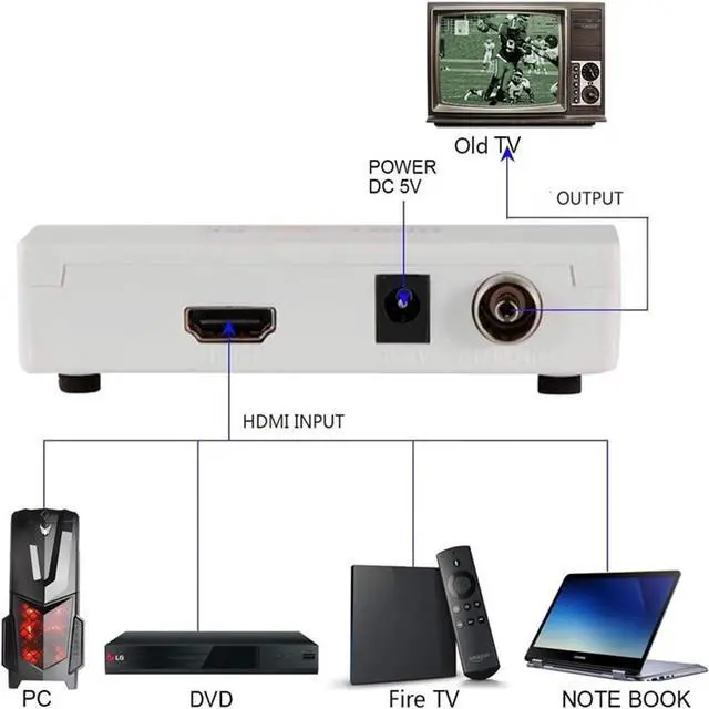 RF Modulator - HDMI to coax converter will hook up your streaming media players ( Apple TV, Fire Stick , Fire TV, Roku , etc.) , game consoles ( PS3 , PS4 , PS5 , Xbox 360 , Xbox One etc.), DVD , Blu-ray players , VCR , Laptop , PC or computer etc. newer HDMI-equipped components with an older TV or video equipment; Then you can watch videos / play games / sharing old pictures / photos on channel 3 on old TV models (CRT) and other non-HDMI devices.