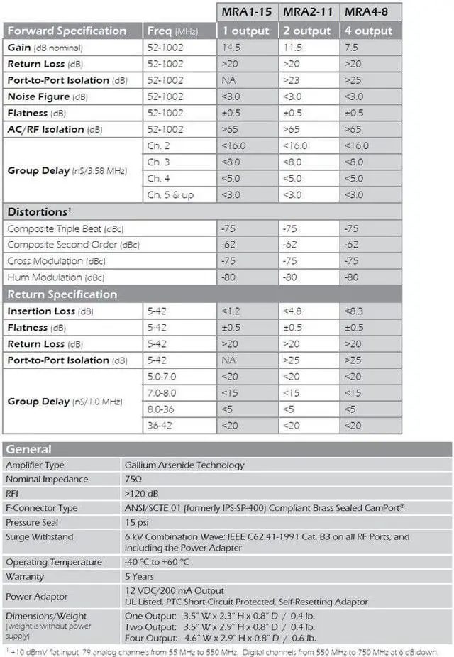 Ideal for both indoor and outdoor applications, the MRA was engineered to withstand the harshest environmental threats with the capability of enduring repeated high power surges. Includes Amplifier, Power Supply, 36" coaxial cable and two 75-ohm port terminators.