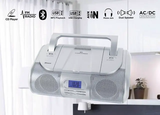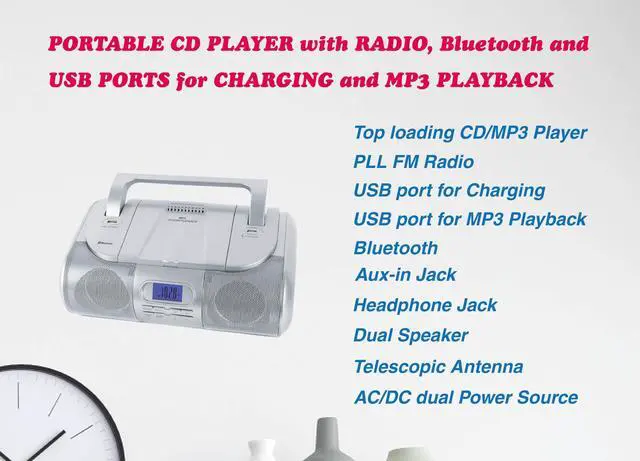 Portable CD/MP3/USB Boombox, FM PLL Radio, Bluetooth, 1 USB Port for MP3 Playback, 1 USB Port for 1A Charging, Aux-In Jack, Headphone Jack, AC/DC Dual Power Source.