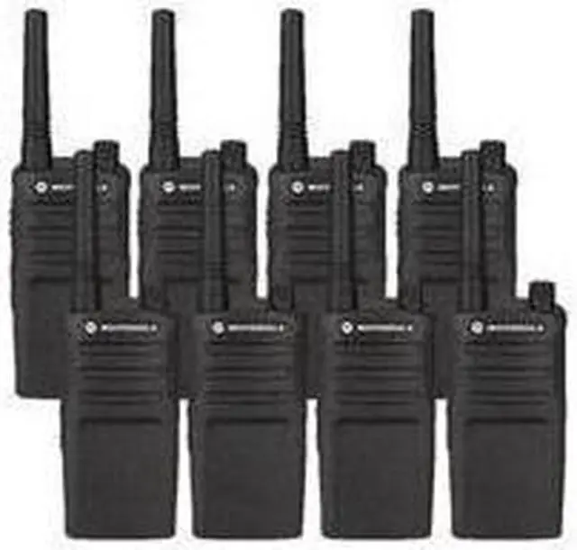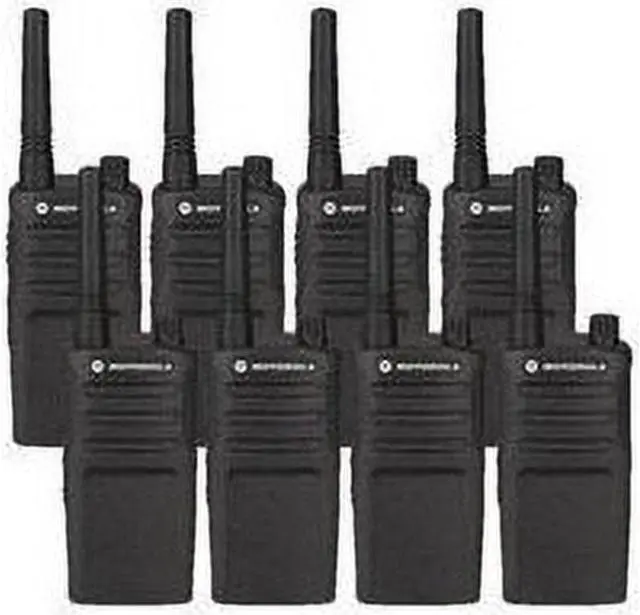 Eight-pack of Motorola RMM2050 radios. Each radio comes complete with a single-unit charger, 15 hour lithium ion battery pack, swivel belt holster and 1-year warranty.