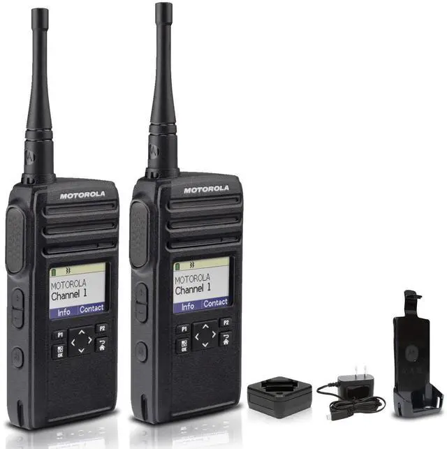 Stay connected with the Motorola DTR700 Digital 2-Way Radio, the ultimate communication solution for businesses and professionals. Engineered for reliability and efficiency, this digital radio offers crystal-clear audio quality and secure communication, ensuring seamless collaboration in any environment. With its innovative digital technology, the DTR700 provides superior coverage and range compared to traditional analog radios. Say goodbye to interference and static with the DTR700, you can communicate clearly and effectively over long distances, indoors or outdoors. The DTR700 features advanced features such as one-to-one calling, group calling, and text messaging, allowing you to communicate with individuals or groups with ease. Its intuitive menu interface and customizable settings make it easy to tailor the radio to your specific needs, ensuring optimal performance in any situation. Designed for durability, the DTR700 is built to withstand the rigors of daily use, with a rugged construction that can withstand drops, shocks, and extreme weather conditions. Whether you're working on a construction site, managing a retail store, or coordinating events, you can rely on the DTR700 to keep you connected and productive. Experience the power of digital communication with the Motorola DTR700 Digital 2-Way Radio. With its unmatched reliability, range, and features, it's the perfect choice for businesses and professionals who demand the best in communication technology.