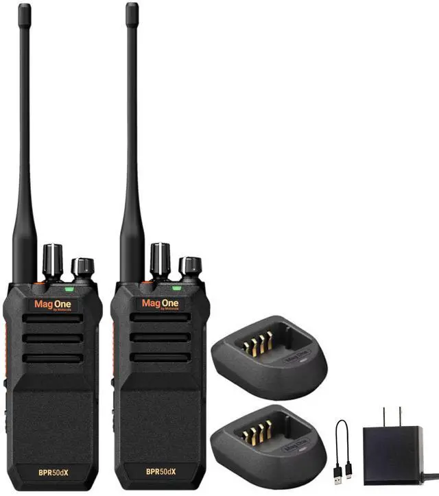 Items Included: 2 X Motorola BPR50dX VHF Digital 5W/64CH Radio, Charger kit (PMLN8599 Base/PS000150A31 - power supply), USB-C charging cable (PMKN4274) belt clip, Spring belt clip (PMLN8600) and 2200mAh Li-ion Battery (PMNN4847)