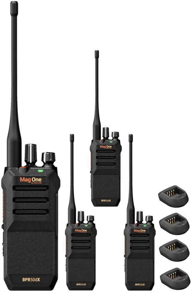 Items Included: 4 x Motorola BPR50dX VHF Digital 5W/64CH Radio, Charger kit (PMLN8599 Base/PS000150A31 - power supply), USB-C charging cable (PMKN4274) belt clip, Spring belt clip (PMLN8600) and 2200mAh Li-ion Battery (PMNN4847)