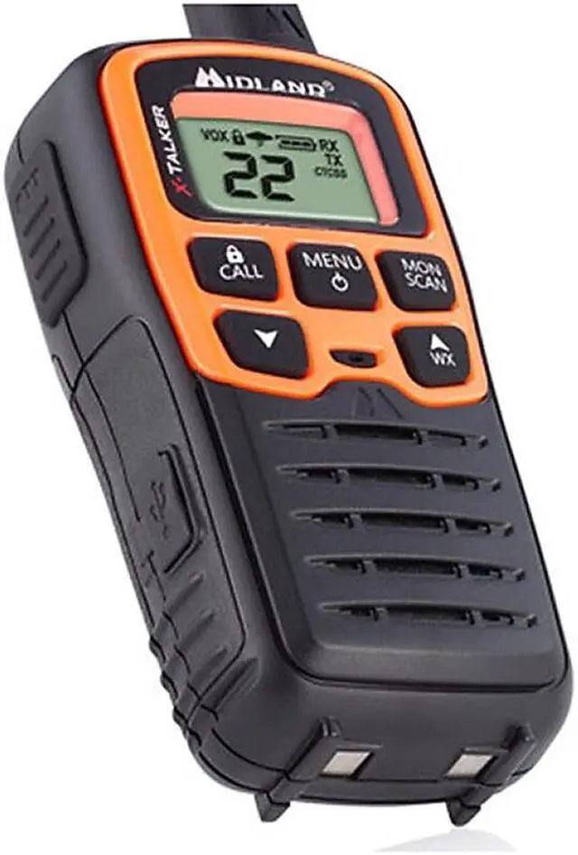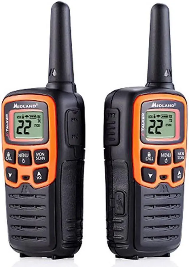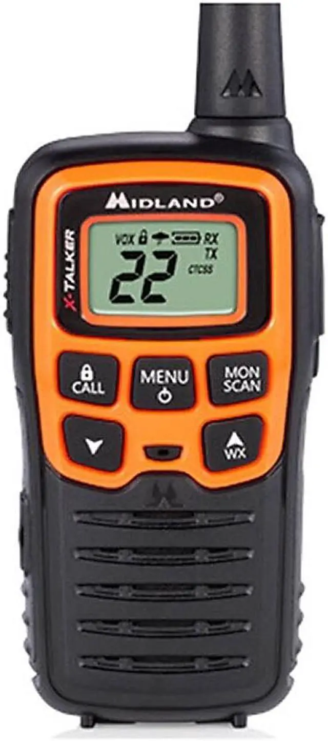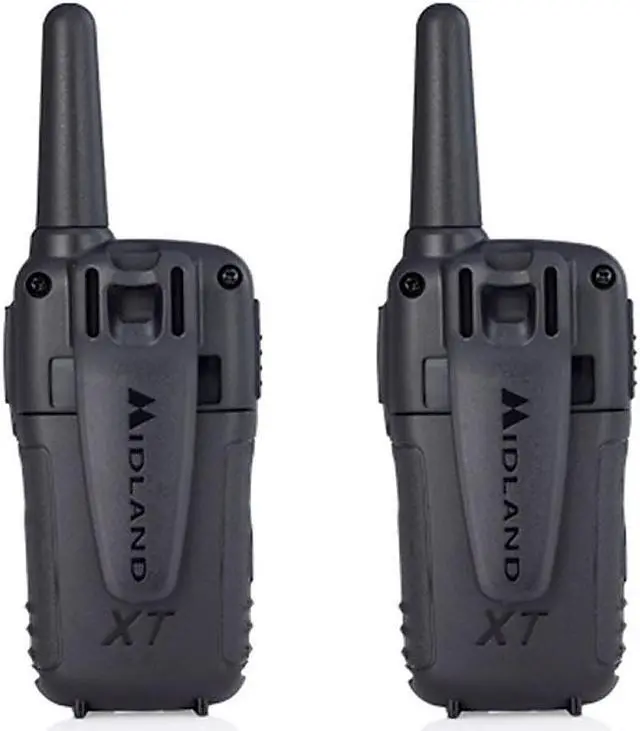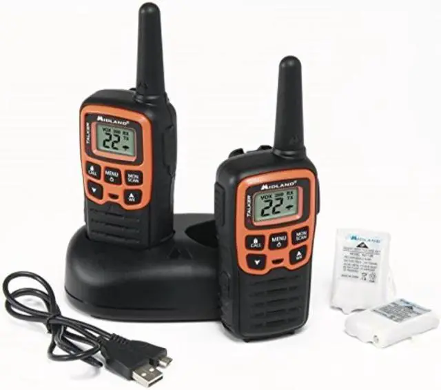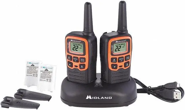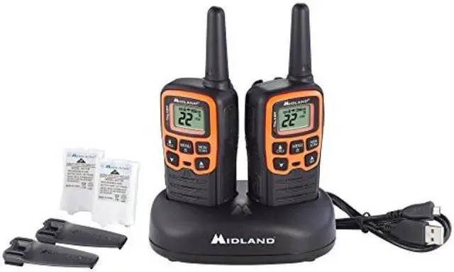 Midland X-TALKER T51VP3 Walkie-Talkie - License Free FRS Radio Clear Reception. Clear Transmission. Clear Sound Quality. A low cost yet reliable solution, the X TALKER has up to a 20-mile range and features 22 Channels, Channel Scan, and our legendary Weather Alert technology. Each radio is powered by three “AAA” batteries (not included). X-Talker T51VP3 Two-Way Radios. 22 Channels. Crisp, clear communication with easy button access. Digital display. Comes with rechargeable battery packs. Includes pair of radios, belt clips, rechargeable battery packs, desktop charger, micro USB charging cable and owner's manual.