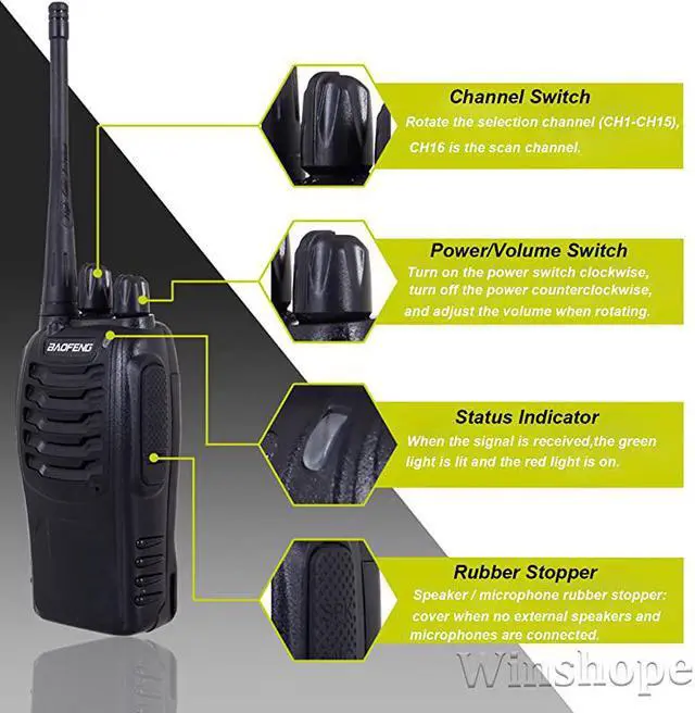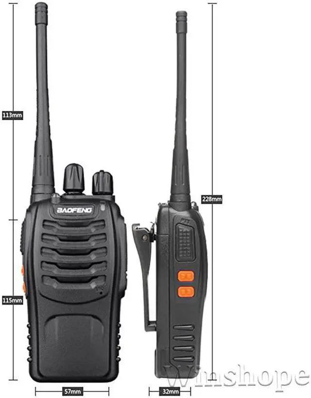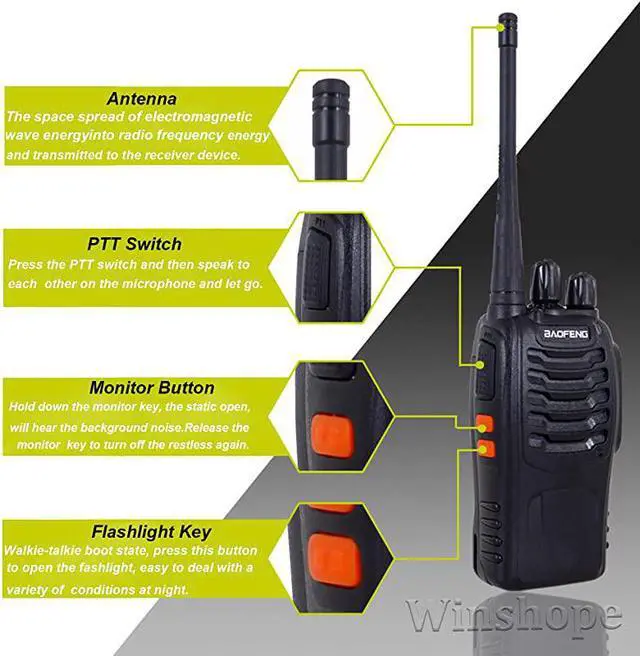 Package Includes: 4 X Walkie Talkies 4 X Antenna 4 X Li-ion battery pack 4 X US Charger 4 X Belt clip 4 X Earpiece 4 X User's manual