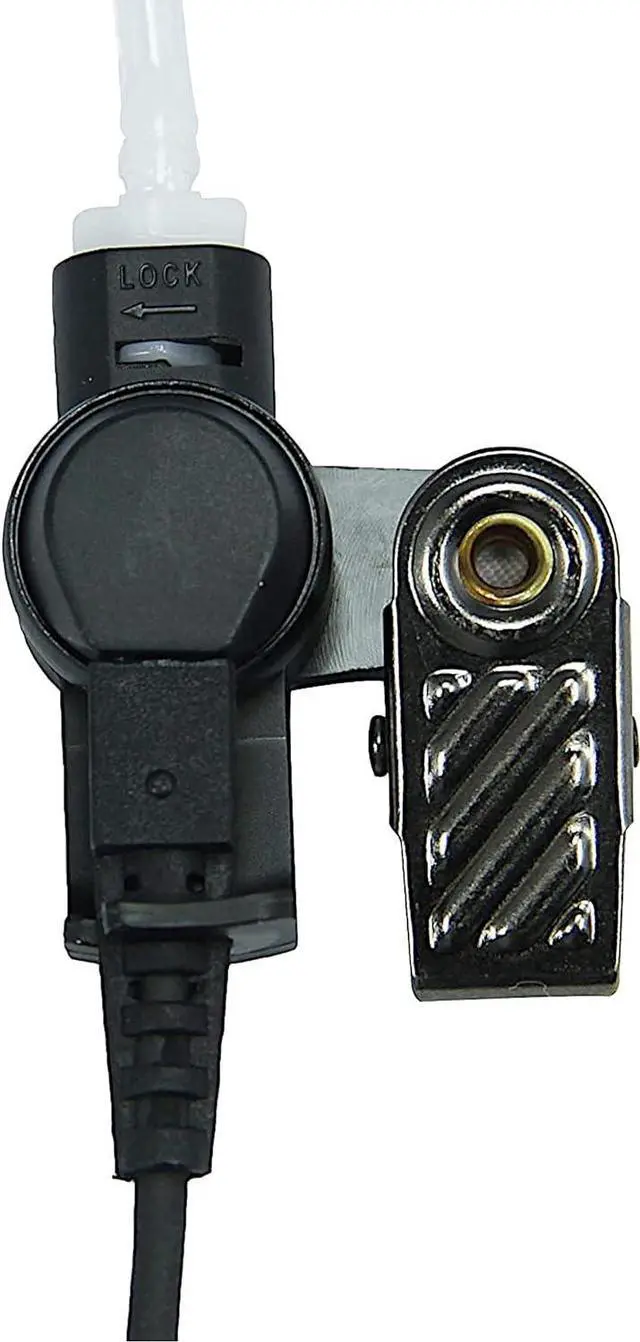 A metal clip secures the mic/PTT to the user' s lapel or collar