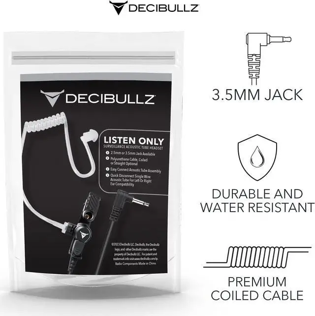 Use: This 3.5 mm listen only headset from Decibullz is easy to use and adapt to the needs of your profession or needs. This headset is a quick disconnect surveillance earpiece that can be combined with custom earplugs or used as is. This listen only earphone kit for speaker mics are used by law enforcement officers, security companies, casinos, retailers and much more. Headset is available for 3.5 MM threaded audio jacks.