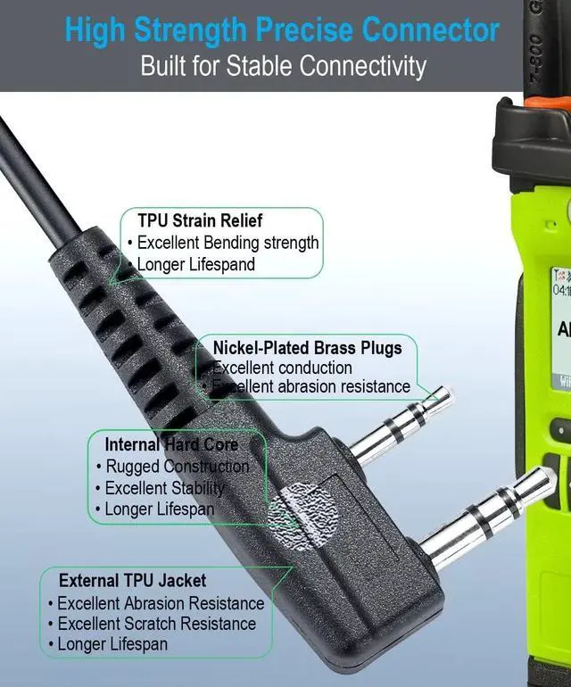 Warranty & Compatibility: Worry-free 12 months warranty; Compatible with Baofeng Kenwood Retevis PXTON Samcom Anytone TYT PUXING WOUXUN two way radios; Compatible for two way radios with Kenwood-type two pin audio jack; including Baofeng UV-5R, BF-F8HP, BF-F8, BF-F9, GT-3TP, GT-3, GT-5R, UV-5G, UV-5R+ PLUS, UV-5RA, UV-5RB, UV-5RE, UV-5RTP, UV-5X, UV-5X3, UV-6R, UV-82, UV-82L, UV-82HP, UV-82C, UV-S9; and GM-30, GA-510, FPCN30A; Kenwood NX TK series radios with two audio jacks.