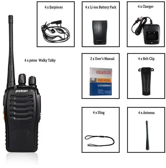 4 × pxton walkie talkies ; 4 × Earpieces;
