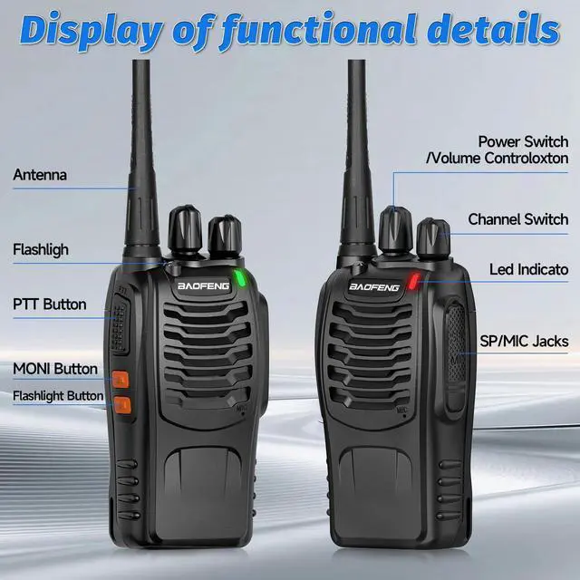 | Included Components | 2 x Base Chargrt, 2 × Antenna&Back Clip&Hanging Rope, 2 × Battery, 2 × Headset, 2× Radio |