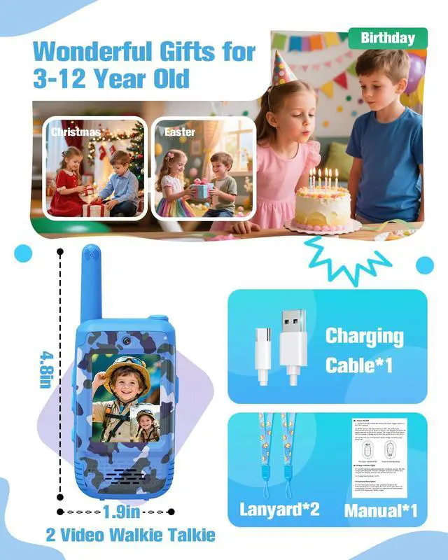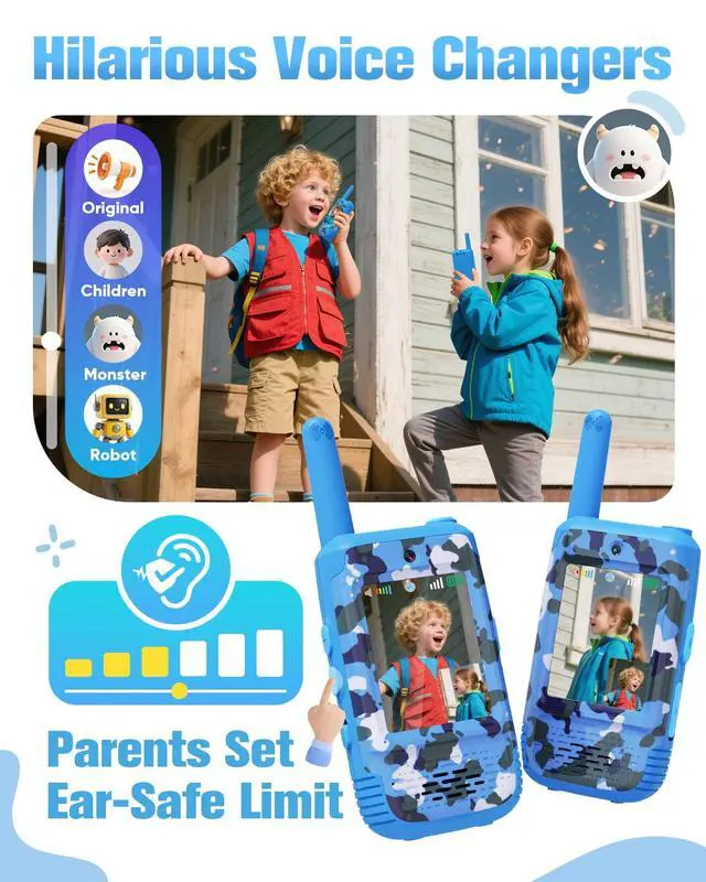 Video Walkie Talkies for Kids with Voice Changer, 2 Pack Rechargeable Kids Walkie Talkies, Outdoor Play Toys Birthday Gifts for 3-12 Year Old Boys Girls, Camping Hiking Family Games