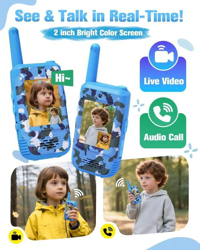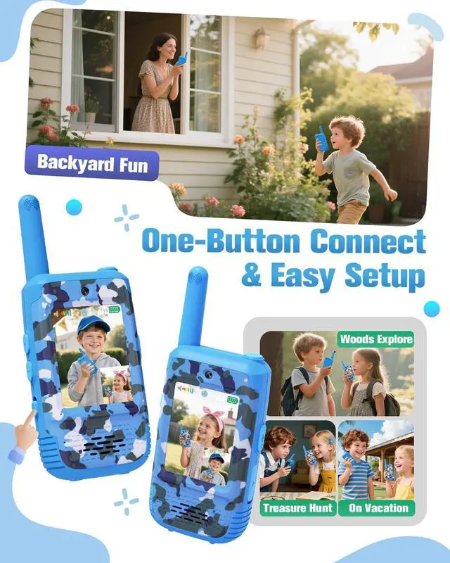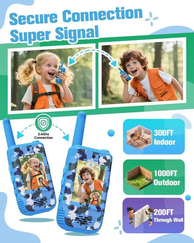 Live Video & Voice: See and Talk in Real-Time! Unlike basic walkie talkies, these video walkie talkies for kids feature a built-in camera and vibrant color screen, letting kids share live video while enjoying clear 2-way voice communication. With a reliable range of up to 300ft indoors and 1000ft outdoors, theyre ideal for backyard hide-and-seek, camping trips, and neighborhood explorationkeeping young adventurers visually connected without missing a moment of fun.