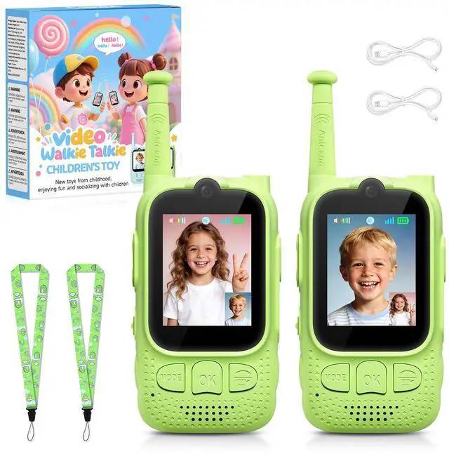 Kids Audio/Video Walkie Talkies, 2 Pack Rechargeable Walkie Talkies for Kids with 2 Screen & Camera & Voice Changer, Long Range Boys Girls Toys for Indoor Outdoor Camping Hiking Games (Green/Green)