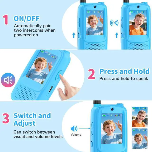 Real-time Video Walkie Talkies: Say goodbye to traditional kids walkie talkies that only transmit voice. Our upgraded kids video walkie talkies features a built-in HD screen and microphone for real-time video calls. The volume is adjustable in six levels. This video walkie talkies is ideal for outdoor play, camping, or park trips.