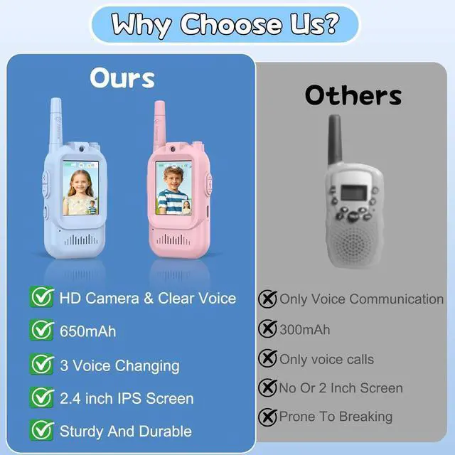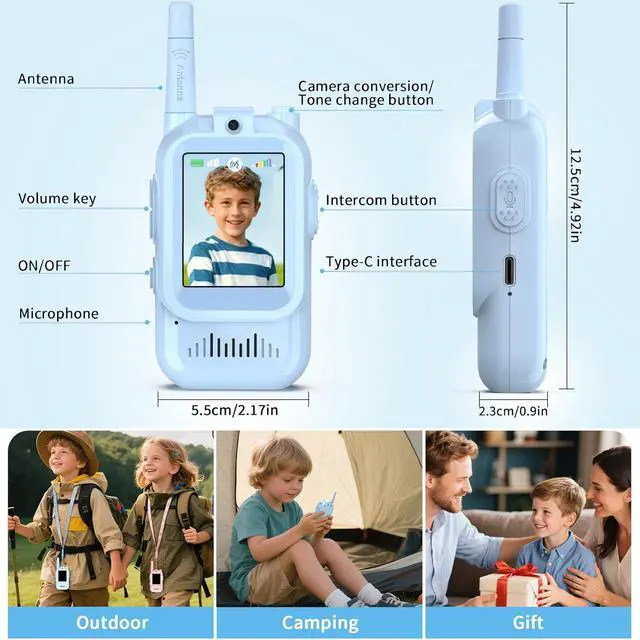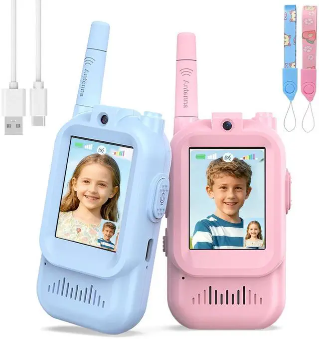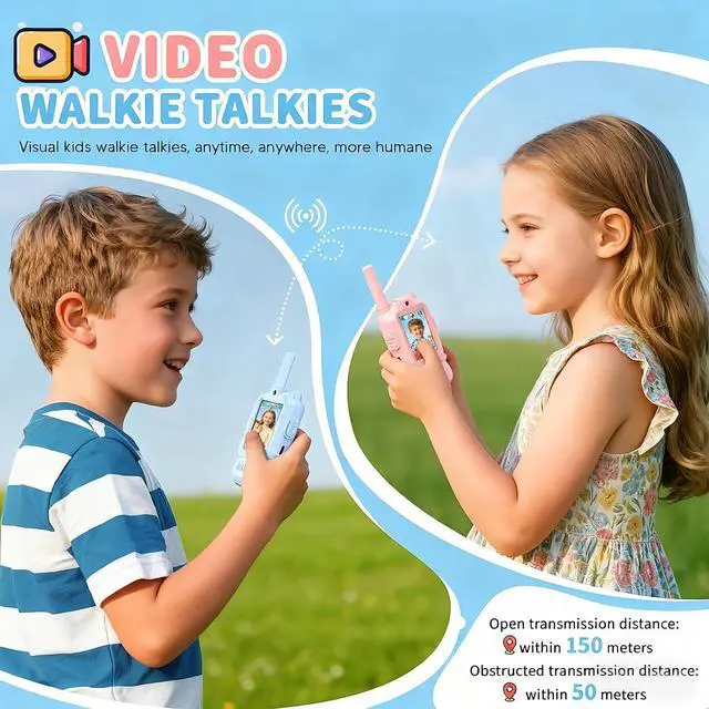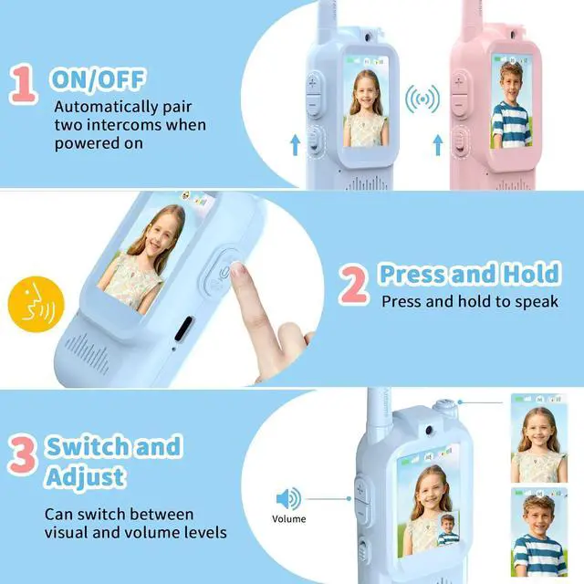 SEE & TALK: REAL-TIME VIDEO CHAT Unlike traditional audio-only gear, our kids video walkie talkies feature a vibrant LCD screen and camera, enabling clear face-to-face interaction. This innovative video intercom brings an immersive calling experience, making backyard hide-and-seek or communicating between upstairs and downstairs safer and more fun.