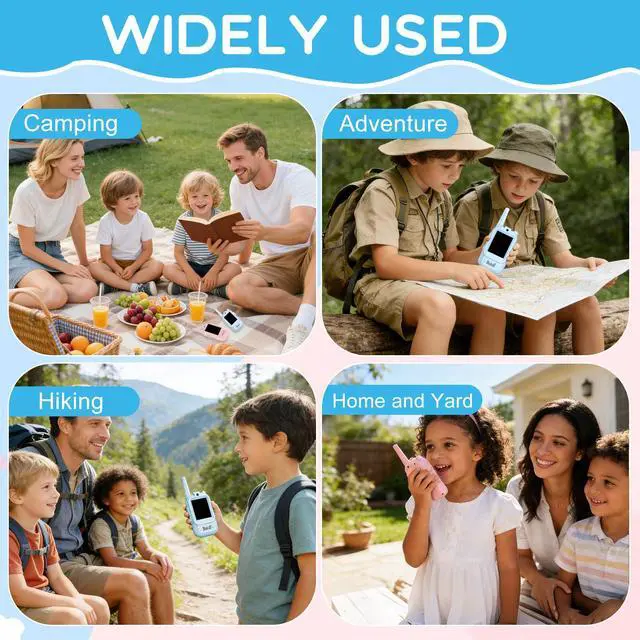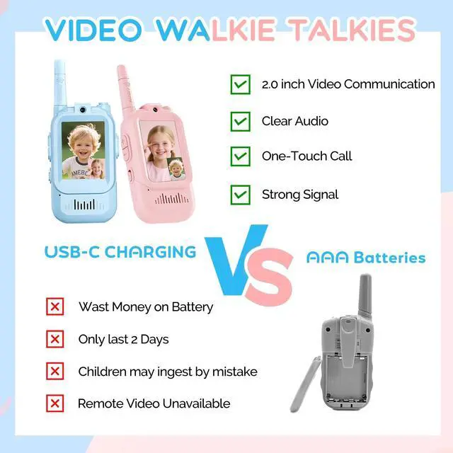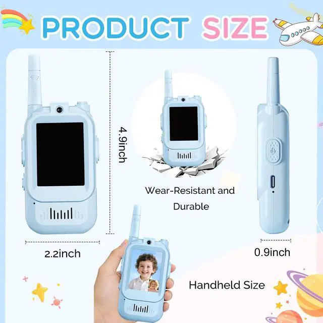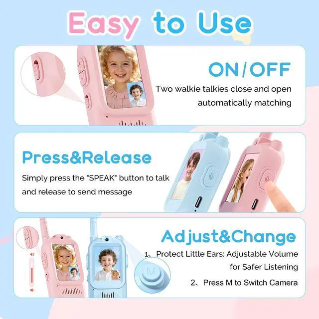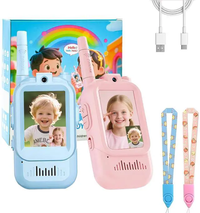 Walkie Talkies for KidsUlike traditional walkie talkies that only transmit sound, These kid walkie talkies have a 2-inch IPS screen, a built-in camera and Auto-Pairing When you Turned On the Kids Video Walkie Talkies, Real-Time Face-to-Face Communication with Friends & Parents. Compact Size Designed for Kids, Snugly Fits Little Hands for Easy Holding, perfect for indoor(room to room, hide and seek), outdoor play and camping.