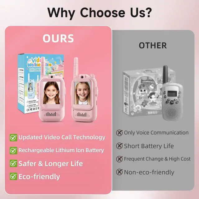 [Rechargeable & Easy to Use]: Our video walkie talkies for kids feature a built-in rechargeable battery with Type-C fast charging, offering 8+ hours of talk time after just a 1-hour charge. No confusing settings, no tuning, auto pairing, just simple push-to-talk buttonsa perfect, easy-to-use kids birthday gift.