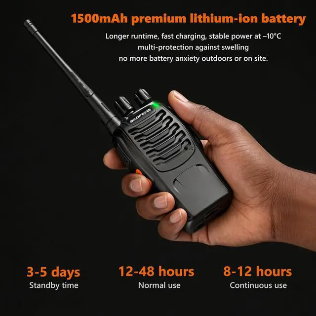 Each walkie talkie packs a high-capacity 1500 mAh Li-ion battery and comes with a desktop USB charging cradle for long-lasting, grab-and-go power.